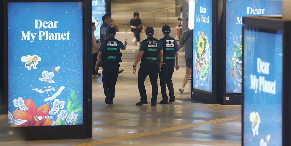 当地时间2023年8月3日,韩国京畿道,城南市购物广场发生“无差别袭击事件”后,警方封锁现场。