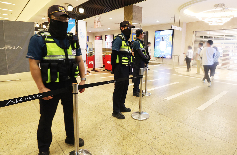 当地时间2023年8月3日,韩国京畿道,城南市购物广场发生“无差别袭击事件”后,警方正在控制现场。