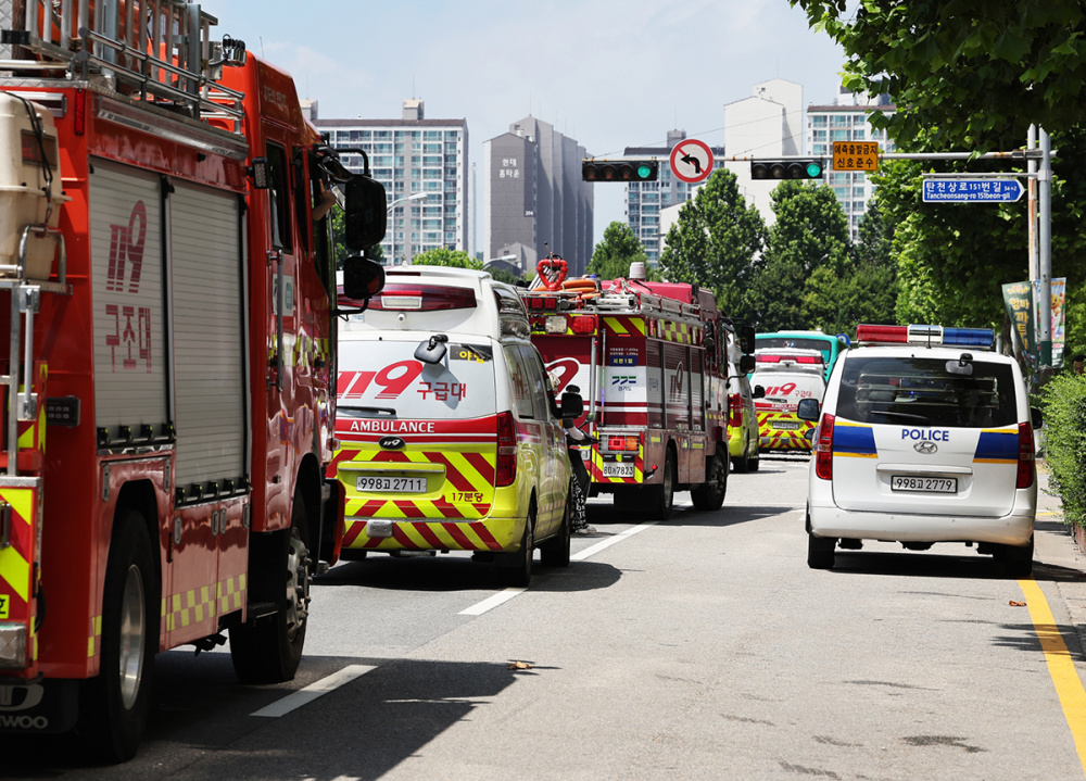 当地时间2023年8月4日,韩国城南市,警车和消防车在西岘地铁站严阵以待。