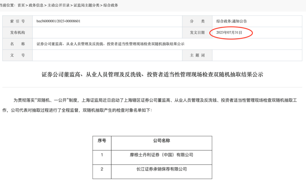 通知显示,为贯彻落实“双随机、一公开”制度,上海证监局近日启动了上海辖区证券公司董监高、从业人员管理及反洗钱、投资者适当性管理现场检查双随机抽取工作,公司代表对抽取过程进行了全程监督。双随机抽取产生的检查对象除了摩根士丹利证券(中国)有限公司,还有长江证券承销保荐有限公司。