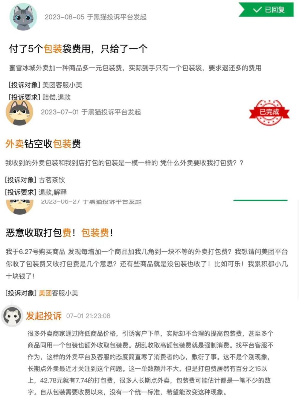 ▲黑猫投诉中消费者关于外卖包装收费的投诉截图