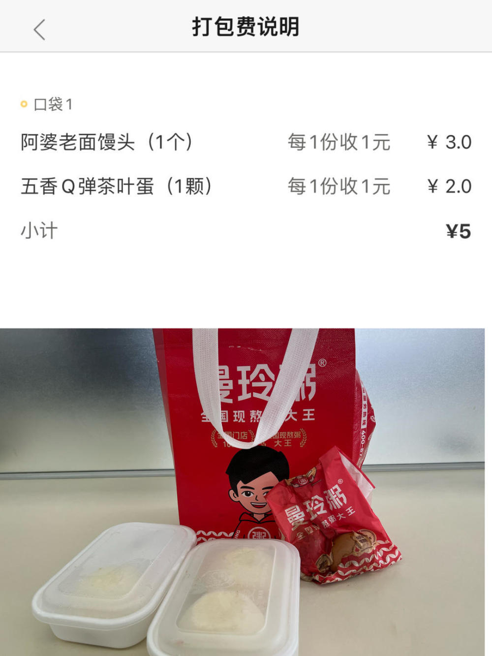 如记者在“曼玲粥店”下单食品就看到,下单一个老面馒头价格为1.9元,按照包装收费标准,每份馒头需额外收取1元打包费。随后记者下单3个馒头,总价为5.7元,额外支付馒头打包费3元。此外,一枚2.9元的茶叶蛋,也同样要按照每份1元收取打包费。记者购买2份茶叶蛋总价为5.8元,另还需支付2元打包费。换言之,购买以上食品的总价达到16.5元,其中食品价格为11.5元,打包费为5元,占比接近一半。