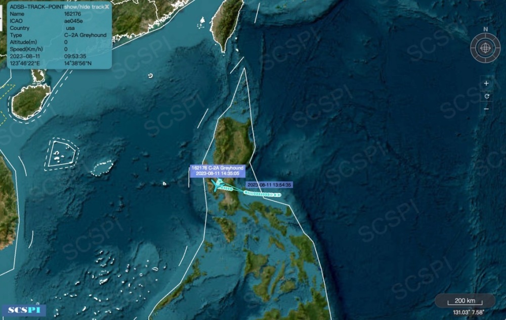 8月11日,根据美海军“里根”号航母舰载机“灰狗”C-2A(AE045E)飞行轨迹判断,航母打击群在菲律宾东部海域航行。综合AIS、舰载机ADS-B和遥感影像,里根号航母在7月11日经过巽他海峡,7月16日在印度尼西亚巴厘岛进行港口访问,8月1日停靠在澳大利亚达尔文基地,8月7日在苏拉威西海活动,然后进入菲律宾海北上。