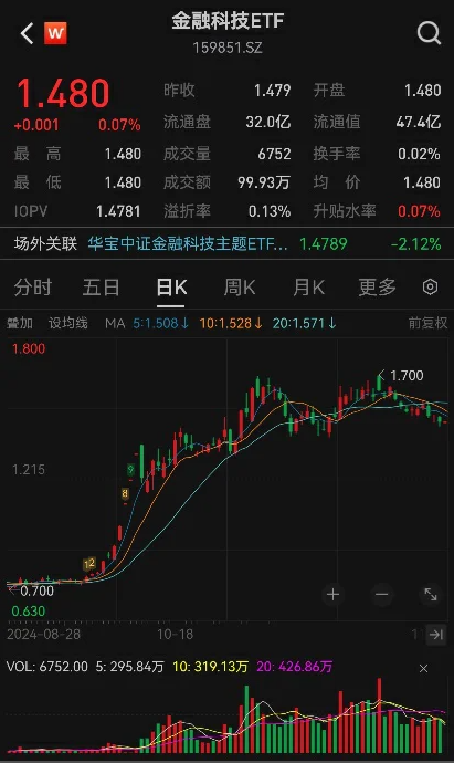 中证指数官网显示,截至2024年12月24日,国内共有3只挂钩金融科技指数的ETF产品,其中华宝基金管理的金融科技ETF(159851),以47.09亿元的最新规模排名第一。最近两个交易日,金融科技ETF(159851)吸金近3亿元,资金加仓力度加大。值得一提的是,金融科技ETF(159851)也是目前唯一拥有场外ETF联接的基金产品;场外基金投资者在投资金融科技指数,目前仅能选择华宝中证金融科技主题ETF联接(A类:013477;C类:013478)。