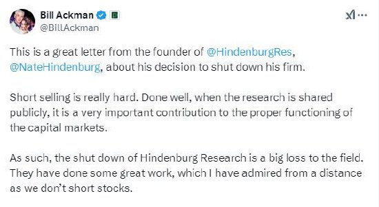 阿克曼周四在社交平台X上发文称:“这是兴登堡研究公司创始人写的一封很棒的信。做空真的很难。如果做得好,当研究结果被公开分享时,它将对资本市场的正常运作做出非常重要的贡献。”