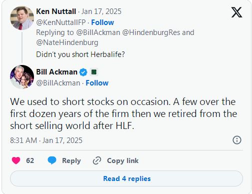 X上的一名用户问阿克曼关于做空康宝莱的问题,阿克曼回答说:“在康宝莱之后,我们退出了做空界。”