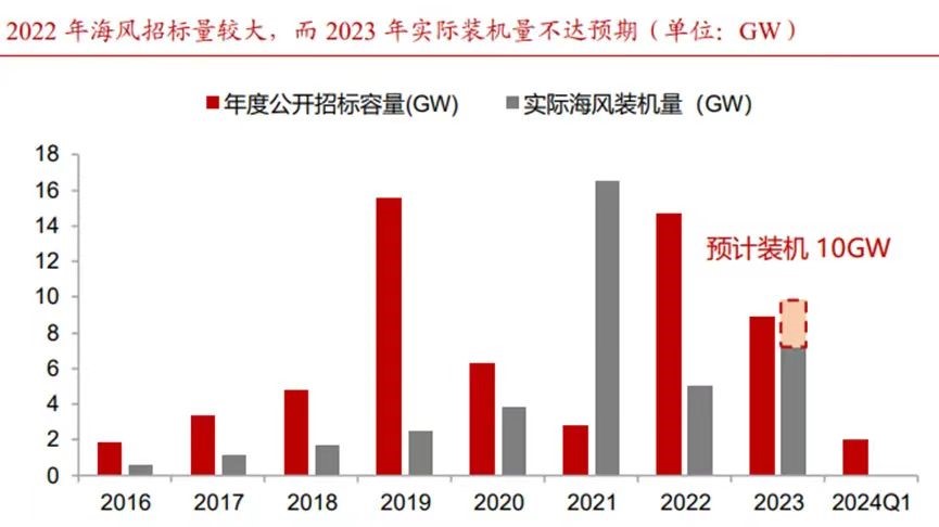 业绩增长怠速的背后是“天量招标,地量装机”的尴尬局面。一般而言,海风项目的建设周期在2-3年,在2021年行业受国补退坡刺激发生抢装潮之后,企业在手订单被快速释放,即使2022-2023年海风招标量仍高,但项目从招标到建设需要时间,近年实际的装机需求寥寥。