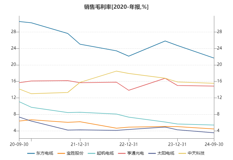 先发优势使三家企业的盈利能力远超同业。东方电缆毛利率常年运行在20%以上,中天科技与亨通光电毛利率也在12%以上徘徊且保持坚挺,而另外三家起帆电缆、宝胜股份(维权)、太阳电缆毛利率在行业压力下逐渐走低,近期已达到8%以下。