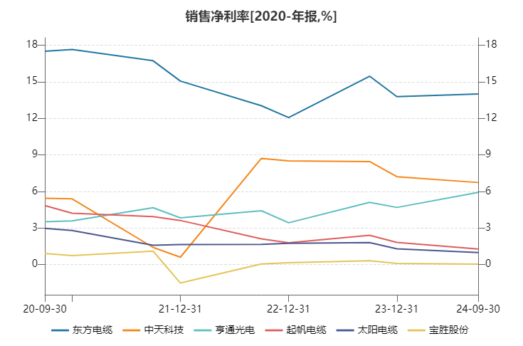 净利率也显现出相同的分化状态。东方电缆的净利率常年高于12%,中天科技与亨通光电近期净利率也在4-7%左右徘徊,而另外三家则持续不振,净利率在3%以下,其中宝胜股份还在盈亏点持续试探。