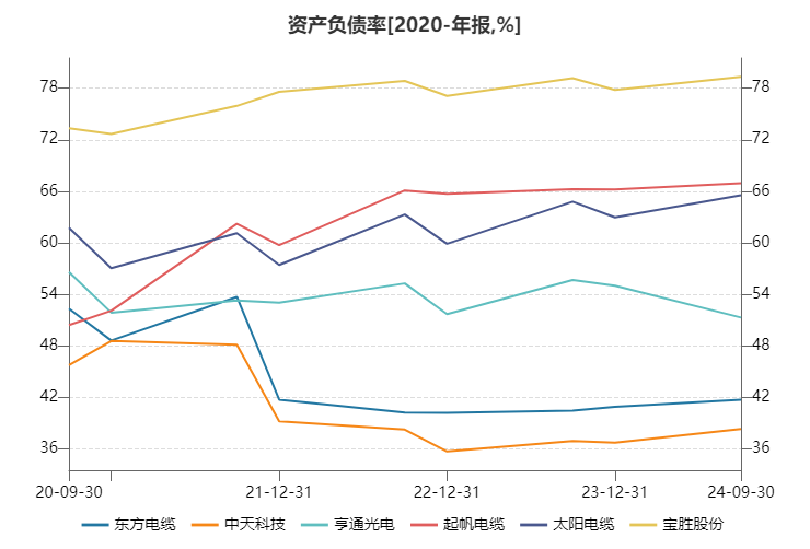 在强大盈利能力的加持下,三家龙头企业的外源融资需求较小,资产负债率指标良好。东方电缆和中天科技近年负债率均在42%以下,亨通光电资产负债率略高,在54%左右。而起帆电缆、太阳电缆、宝胜股份三家则处于60%以上,且仍处于提升态势。