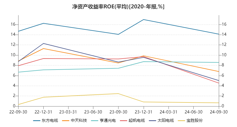 比较各企业近年ROE表现,除东方海缆ROE常年在显著高于同业的14%以上、宝胜股份ROE运行在2%以下的行业低点以外,其余4家未有太大差距,23年均在9%左右,24年前三季度均跌落至更低区间。