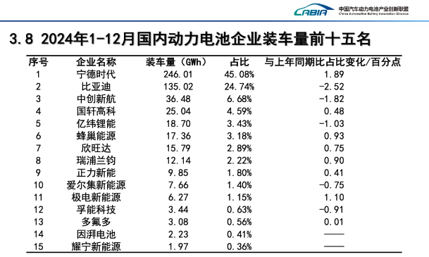 从规模最大的动力电池看,2024年头部企业竞争格局相对稳固,装车量前五大公司中,宁德时代和国轩高科表现更优,与上年相比,市占率分别增加1.89和0.48个百分点,市场份额进一步提升。