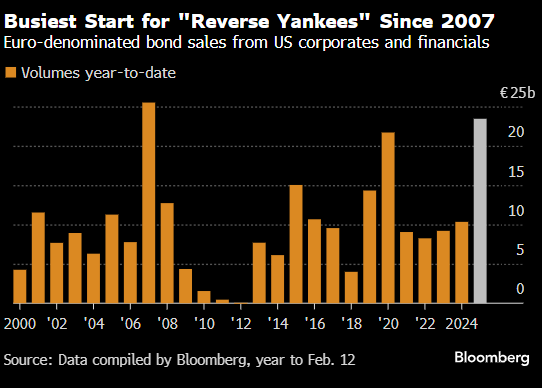 美国蓝筹公司正在以极快的速度发行欧元债券,以期锁定大西洋彼岸低出许多的借贷成本。