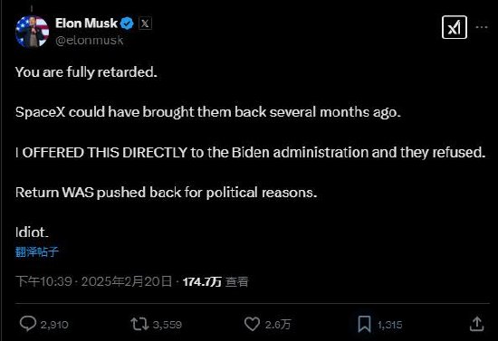 马斯克回应道:“你真是个智障。SpaceX本可以在几个月前把它们带回来的。我直接向拜登政府提出了这个建议,他们拒绝了。由于政治原因,回归被推迟了。白痴。”