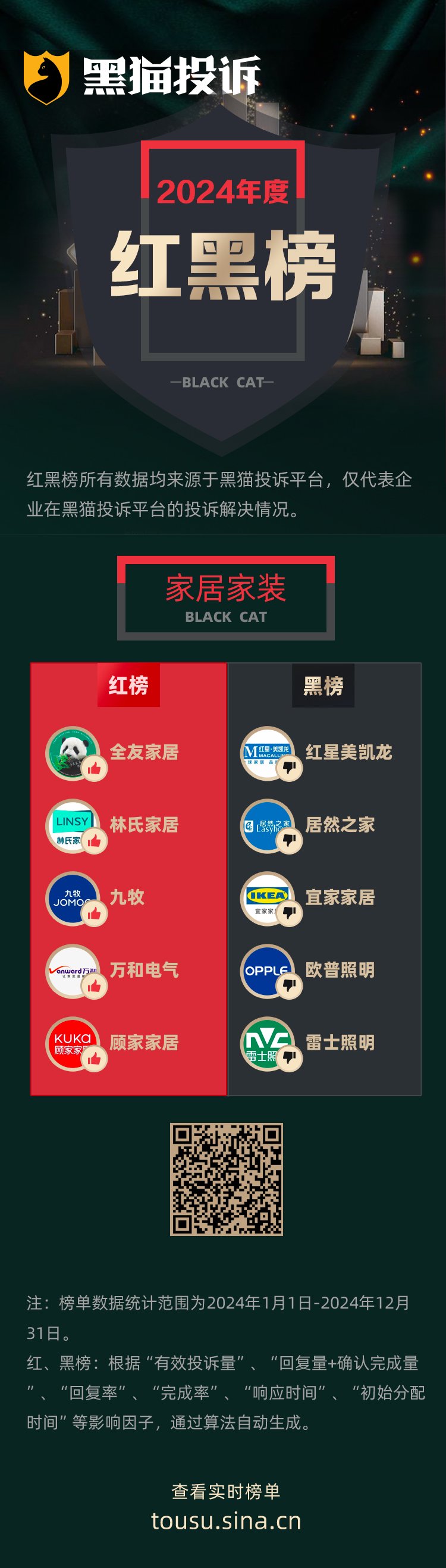 截至2024年底,黑猫投诉平台累计收到有效投诉超2304万件,超1759万件消费纠纷得到企业回复。年度企业红黑榜单根据2024年全年企业在黑猫平台的投诉处理数据,公正客观、开放透明地反映商家对待消费纠纷的服务态度及服务质量。一方面希望全行业以优质服务企业为标杆,为消费者提供更好的消费体验和更优质的售后服务;另一方面也是对不负责任企业的监督与曝光,为消费者提供选购参考。