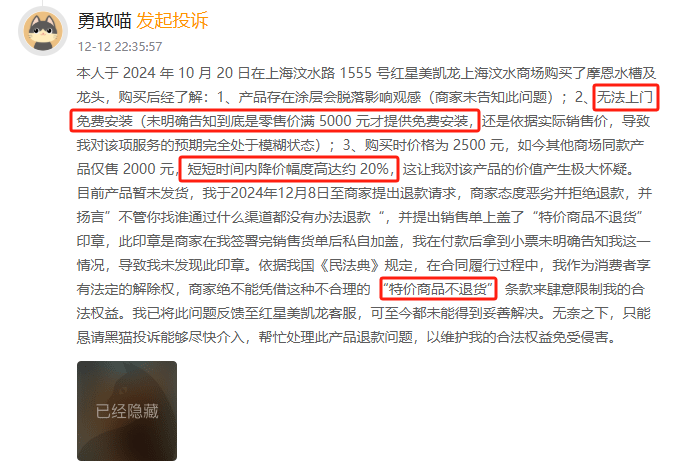 在本年中黑猫投诉平台收到用户反馈称,在红星美凯龙购买了摩恩水槽及龙头后,才得知无法享受上门免费安装服务,且短期内该商品降价幅度高达约20%,用户便在未发货前申请了退款流程,但商家却以 “特价商品不退货”为由拒绝了该诉求。截至2024年底,红星美凯龙累计投诉1184件,回复率仅为12%。