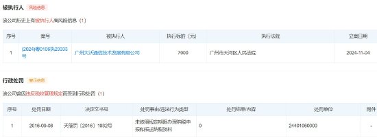 《5D调查》搜索发现,2024年11月04日,该公司曾被广州市天河区人民法院列为被执行人,执行标的为7000元。此外,在2016年09月08日,公司曾因“未按照规定期限办理纳税申报和报送纳税资料”受到行政处罚。