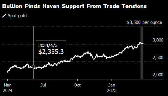 黄金升至历史新高,因美国总统唐纳德·特朗普宣布汽车税,同时高盛上调年底金价预测至每盎司3300美元。