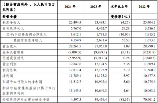 2024年,渝农商行实现营业收入282.62亿元,同比增长1.09%;净利润117.89亿元,同比增长5.97%;归属于本行股东的净利润115.13亿元,同比增长5.60%;扣除非经常性损益后归属于本行股东的净利润111.44亿元,同比增长4.64%;经营活动产生的现金流量净额45.98亿元,同比减少88.35%。