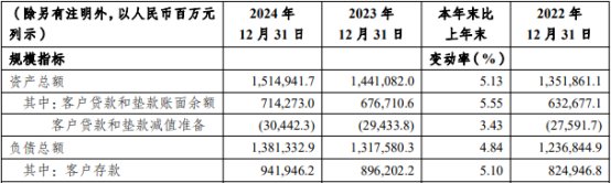 截至2024年12月31日,渝农商行资产总额为15,149.42亿元,较上年末增加738.60亿元,增幅5.13%,客户贷款和垫款账面余额7,142.73亿元,较上年末增加375.62亿元,增幅5.55%。;负债总额13,813.33亿元,较上年末增加637.53亿元,增幅4.84%,存款总额9,419.46亿元,较上年末增加457.44亿元,增幅5.10%。