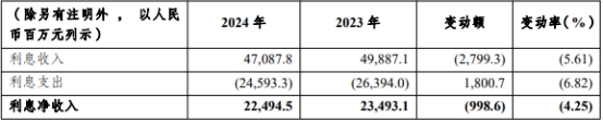 2024年,渝农商行实现利息净收入224.95亿元,同比减少9.99亿元,降幅4.25%。其中,利息收入470.88亿元,同比减少27.99亿元,降幅5.61%,主要受市场利率下调影响;利息支出245.93亿元,同比减少18.01亿元,降幅6.82%。