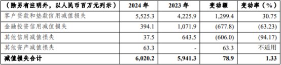2024年,渝农商行减值损失60.20亿元,同比增加0.79亿元,增幅1.33%。其中,客户贷款和垫款信用减值损失同比增加12.99亿元,主要是集团上年实现大额不良资产处置收回,客户贷款和垫款信用减值损失比较基数较低。
