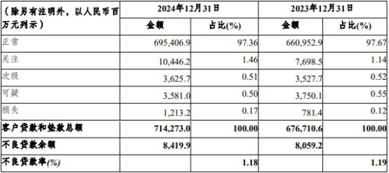 截至2024年末,渝农商行不良贷款余额84.20亿元,较上年末增加3.61亿元;不良贷款率1.18%,较上年末下降0.01个百分点,其中,主城不良贷款余额占本集团的60.83%,县域不良贷款余额占集团的39.17%。