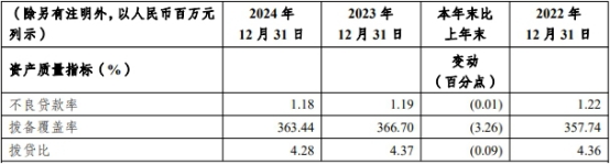 截至2024年末,渝农商行的拨备覆盖率为363.44%,较上年末下降3.26个百分点。