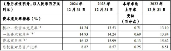 截至2024年末,渝农商行资本充足率为16.12%,较上年末上升0.13个百分点;核心一级资本充足率、一级资本充足率分别为14.24%、14.93%,较上年末上升0.71、0.69个百分点。