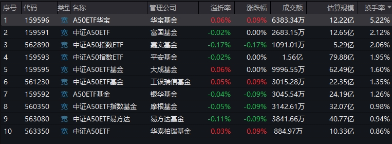 4月1日,截止午间收盘,A50ETF华宝(159596)涨0.09%,报1.116元,成交额6383.34万元,溢价率、涨幅、换手率均位居同类10只产品第一名。