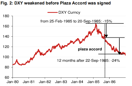 根据野村证券分析,在重大政策协议达成之前,市场常常会提前反应。例如,在1985年9月22日“广场协议”之前,美元在七个月前就开始大幅贬值,美元指数下跌约15%。协议签署后的12个月内,美元指数进一步下跌了24%。当时各国央行也是美元的主要卖方,德国央行在1985年2月至3月期间积极抛售美元。