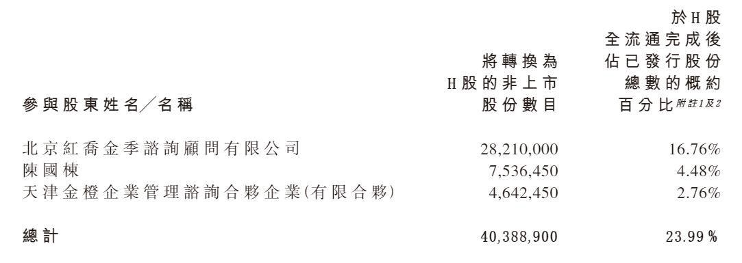 4月1日,老铺黄金发布公告称,香港联交所批准公司三名股东(北京红乔金季咨询顾问有限公司、陈国栋、天津金橙企业管理咨询合伙企业)持有的约4,039万股非上市股份将被转换为H股,并可在市场上自由买卖。根据公告,此次转换完成后,H股占比将从19.72%跃升至80.28%。