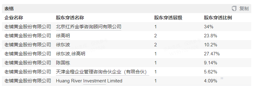 另一面,老铺黄金股权高度集中。根据证券时报网报道,公司实际控制人徐东波、徐高明合计控制上市公司67.66%的股份。公司前5大股东合计持有14297.65万股,占上市后已发行股份总数的84.92%;前十大股东合计持有15257.23万股,占上市后已发行股份总数的90.62%。