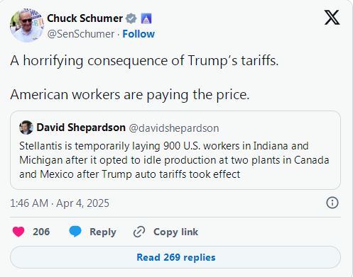 美国参议院民主党领袖查克·舒默在社交媒体X上发帖称,斯特兰蒂斯的裁员是“特朗普关税的可怕后果,美国工人正在付出代价”。