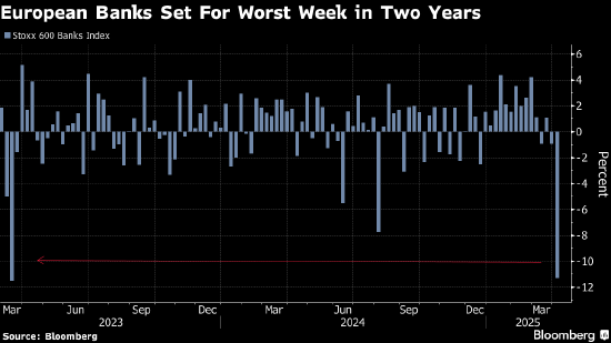 银行股连续第二天成为欧洲表现最差的板块,市场担心美国总统唐纳德·特朗普的关税会拖累经济增长。