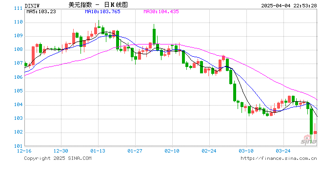 Wind数据显示,4月2日当日,美元指数收跌0.54%;4月3日,美元指数一度跌至101.26,创2024年10月以来新低,截至当日收盘下跌1.66%。截至发稿,美元指数报101.939,日内跌0.01%,周内跌2.04%。