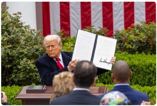 4月2日,美国总统特朗普在华盛顿白宫展示签署后的关于所谓“对等关税”的行政令。新华社记者胡友松摄 贝森特的说法随即招致广泛批驳。有网友评论说:“一个恶霸攻击你,然后恶霸说放松点,什么也别做。世界不是如此运转的。”
