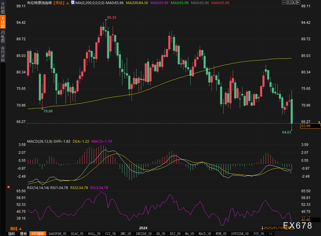 汇通财经APP讯——本周国际原油市场遭遇2021年以来最剧烈震荡,布伦特与美国WTI原油双双创下逾两年最大单周跌幅。贸易保护主义浪潮与产油国联盟意外增产形成“双重暴击”,叠加经济衰退阴霾笼罩,全球大宗商品市场集体陷入避险模式。截至周五(4月4日)收盘,布伦特原油暴跌6.5%至65.58美元/桶,WTI原油重挫7.4%至61.99美元/桶,盘中更一度跌破60美元心理关口。
