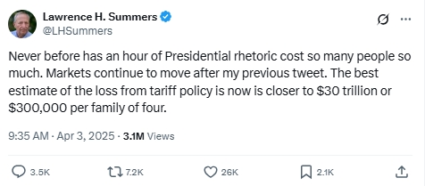“从来没有一个小时的总统演讲让这么多人付出如此高昂的代价。在我上一条帖子之后,市场继续波动。目前对关税政策损失的最佳估计是接近30万亿美元(原文如此)或每个四口之家30万美元,”他在X上的一篇帖子中写道。