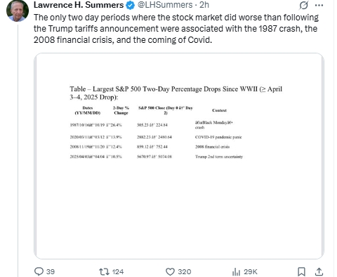 美国前财长萨默斯周六在X上发帖称,自二战以来,标普500指数连续两个交易日表现比特朗普宣布关税后更糟的,只有1987年股灾(26.4%)、2008年金融危机(12.4%)和新冠疫情爆发(13.9%)时。