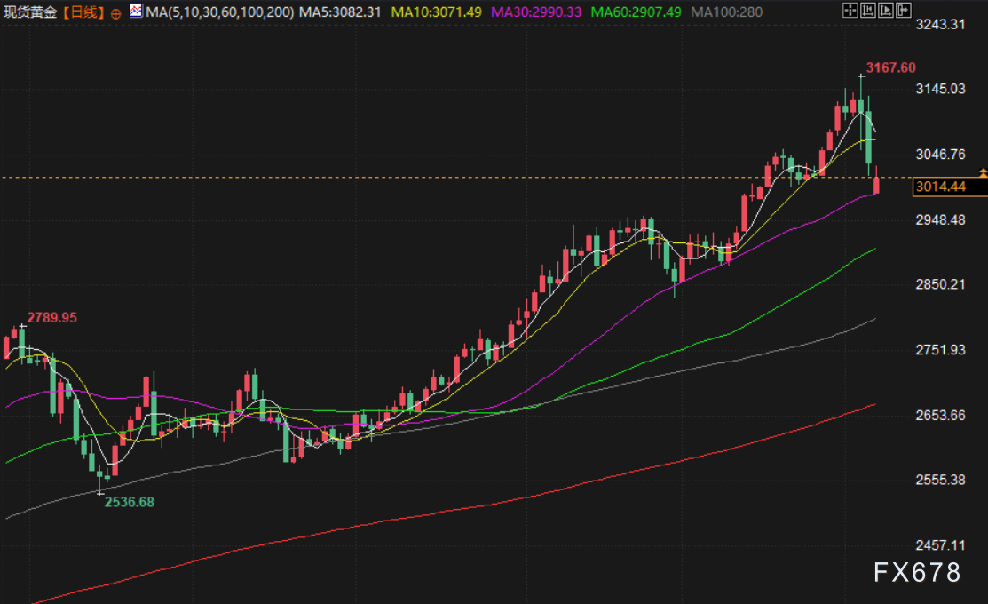 黄金上周五下跌超过3%,抹去了上周早些时候的涨幅,因贸易战加剧引发了对全球经济衰退的担忧,投资者抛售黄金以弥补他们在更广泛的市场崩溃中的损失。现货金报每盎司3030.66美元,下跌2.6%,稍早触及3016.49美元的盘中低点。上周四曾创下3167.57美元的历史新高。美国期金报3,049.20美元,下跌2.3%。技术面上,现货金价成功守在21日移动均线3023美元上方。