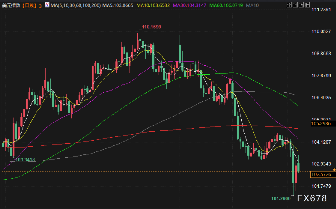 市场预测美联储将在今年剩余时间内降息四次。市场还完全消化了欧洲央行将在12月前降息三次、每次 25 个基点的预期。 美元指数上涨0.98%, 至103,上周四急挫 1.9%,创2022 年 11 月以来最糟糕表现。
