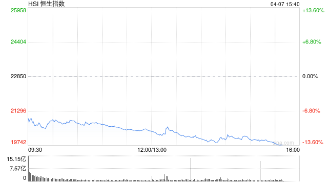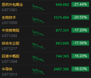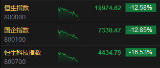 港股三大指数午后持续走低,截至发稿,恒指跌12.58%,失守20000点关口,创两个月新低;恒生科技指数跌16.53%;国企指数跌12.85%。生物技术、中资券商股、汽车股等板块跌幅居前;维亚生物跌超30%,高伟电子跌近30%,零跑汽车跌超25%。