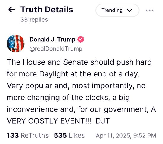 特朗普在Truth Social上发帖称,傍晚多些日照“非常受欢迎,最重要的是,不再需要调时钟了,这非常不方便,而且对我们的政府来说,也很费钱!!!”