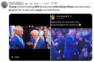 【环球网报道 记者 闫珮云】特朗普在活动现场故意冷落小罗伯特·肯尼迪的妻子海因斯?综合美媒报道,美国总统特朗普当地时间12日晚前往迈阿密观看UFC 314终极格斗冠军赛,他在现场与美国卫生与公共服务部长小罗伯特·肯尼迪握手后,似乎故意忽视小罗伯特·肯尼迪的妻子海因斯向他伸出的手,而这尴尬一幕被现场媒体捕捉到并迅速在社交媒体上引发争议。