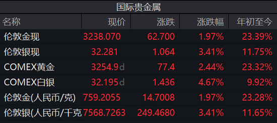 截至收盘,伦敦现货金收报3238.07美元/盎司,今年来上涨23.39%;纽约商品交易所黄金期货价格收报3254.9美元/盎司,今年来涨幅为23.32%。国际金价再次创出了历史新高。