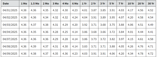 截至当地时间4月9日尾盘,10年期美债收益率从日高4.51%回撤,将涨幅收窄至8BPs,报4.34%。就在上周,10年期美债收益率还在3.9%一线徘徊,数日间一度攀升超60BPs。超长端品种更是走出极致行情,30年期美债收益率一度触及5.02%,创2023年11月以来最高水平,9日尾盘报4.72%。另据机构数据,iShares20年期以上美国国债ETF在本周已经累计下跌超6%。