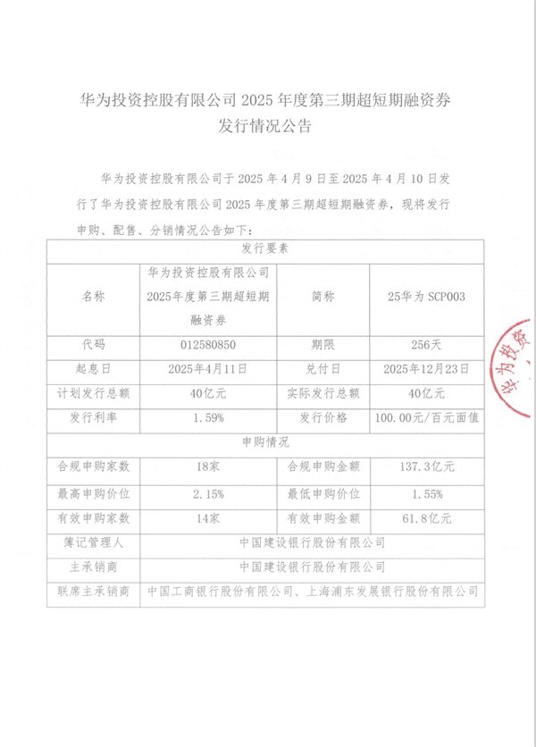 快科技4月14日消息,根据上海清算所官网公告,华为投资控股有限公司于2025年4月9日至2025年4月10日发行了2025年度第三期超短期融资券,总额40亿元。