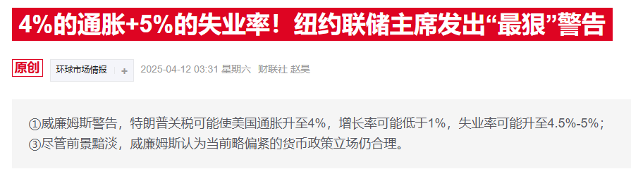 上周五,纽约联储主席约翰·威廉姆斯警告,特朗普推出的关税措施可能会使今年的美国通胀飙升至3.5%至4%之间,同时推高失业率并严重打击经济增长。