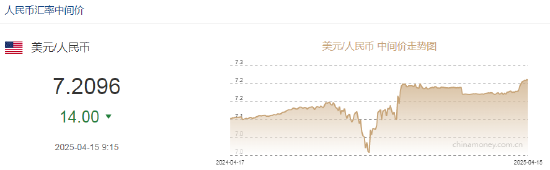 4月15日,人民币兑美元中间价报7.2096,上调14点。